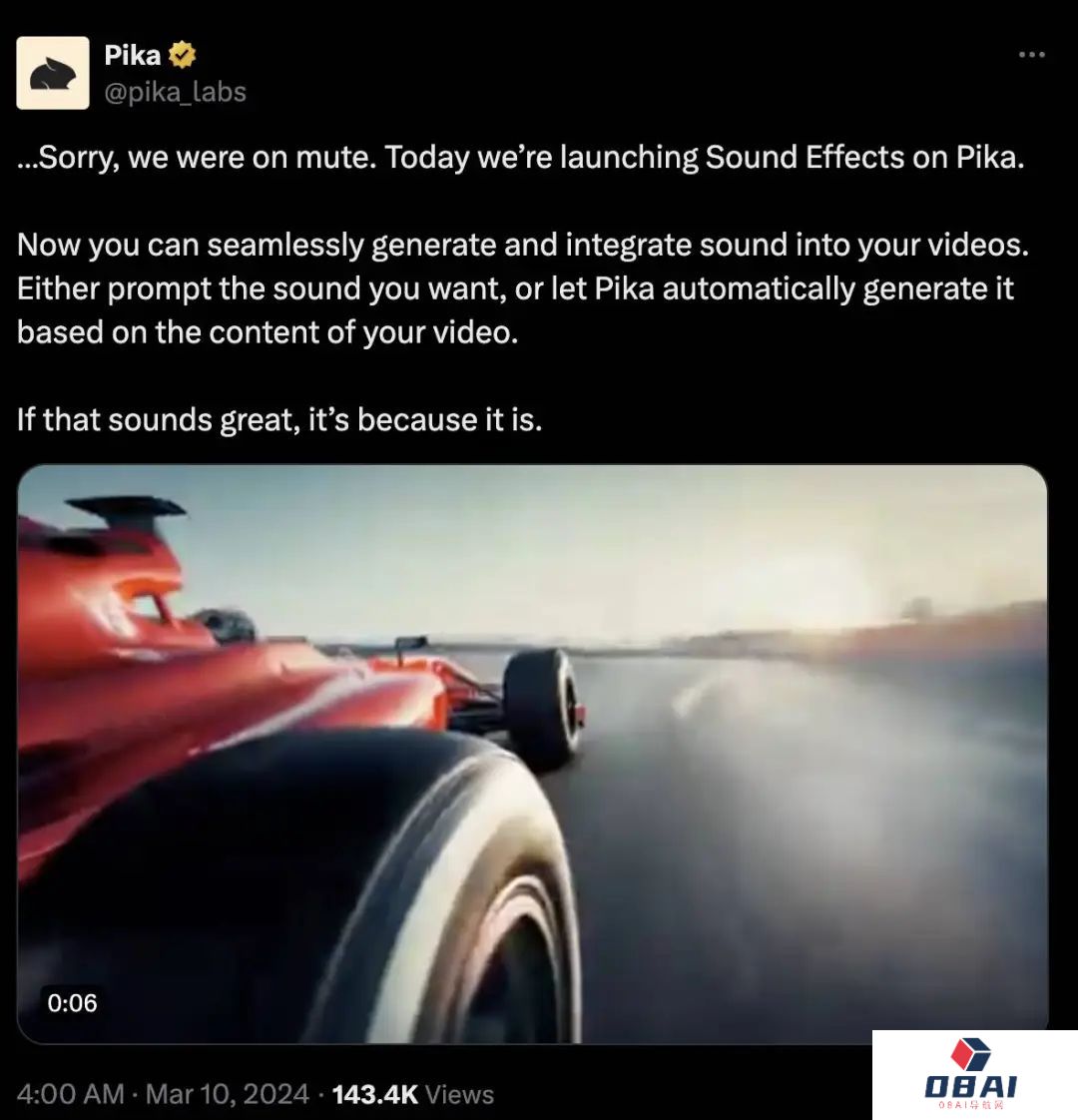 目前该音效生成功能为测试版,仅面向 Super Collaborators 和专业用户推出,Pika 表示很快会向所有用户推出该功能。