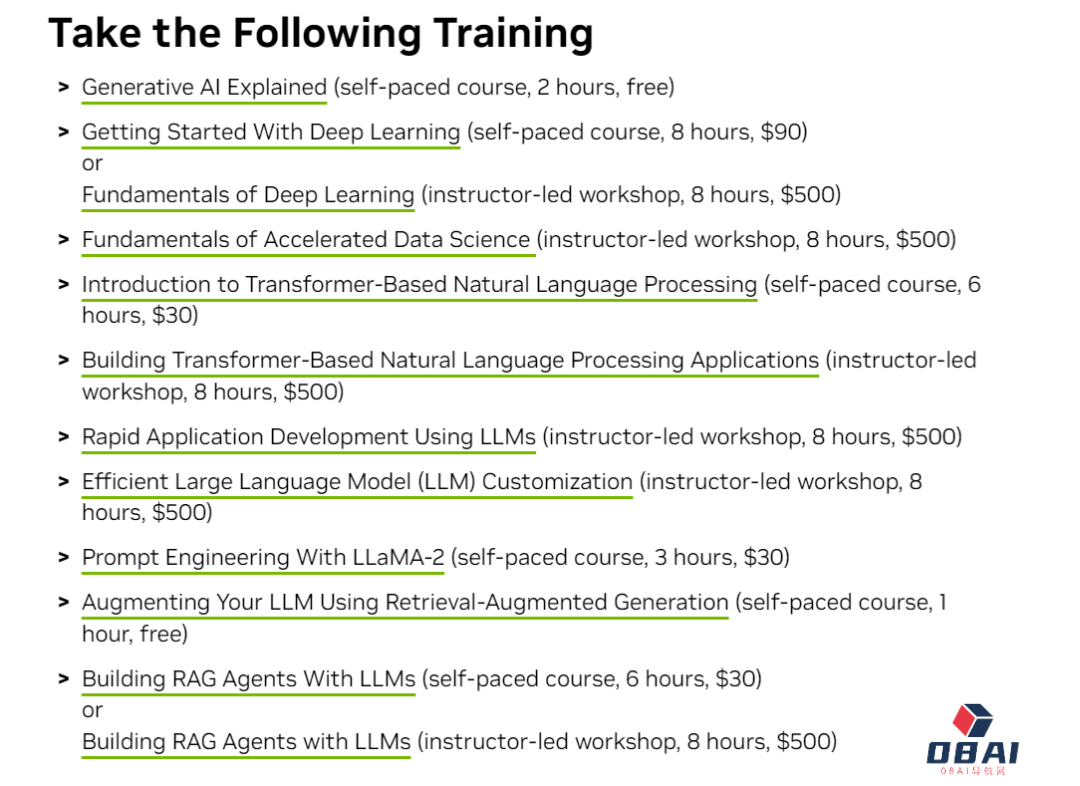 同时英伟达也推出了相应的培训课程,包括生成式AI解释,深度学习入门/基础知识,基于Transformer 的自然语言处理,使用大语言模型进行定制应用开发,大语言模型的部署、定制、微调等,帮助学员顺利通过考试。