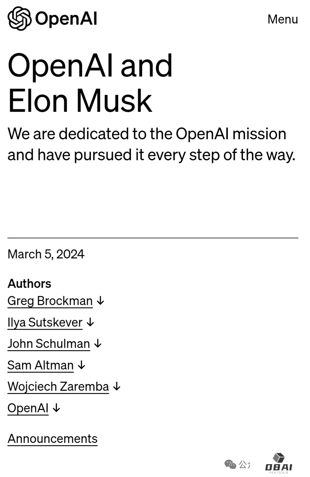 当地时间2月29日,马斯克以个人名义,向旧金山法院提请诉讼,将OpenAI及其CEO奥特曼在内的主要高管告上法庭,主张要求OpenAI重新将技术路线转为开源,并且禁止OpenAI与微软通过AI技术获利。3月5日,OpenAI官网放出文章,正面回应马斯克的控诉,计划驳回全部诉求。