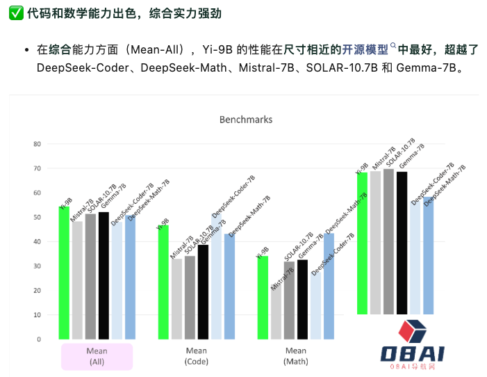 在数学能力方面(Mean-Math),Yi-9B 的性能仅次于 DeepSeek-Math-7B,超越了 SOLAR-10.7B、Mistral-7B 和 Gemma-7B。