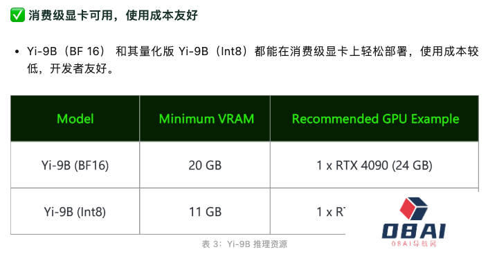 官方更声称,Yi-9B(BF 16) 和其量化版 Yi-9B(Int8) 都能在消费级显卡上轻松部署,使用成本较低,开发者友好。