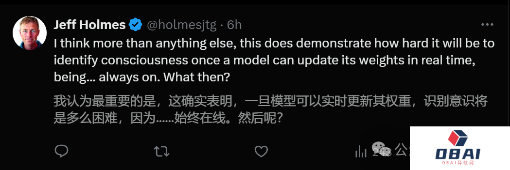 其实可怕的地方在于,一旦大模型可以实时更新自己的权重,识别它的意识会非常困难,因为它永远在线……