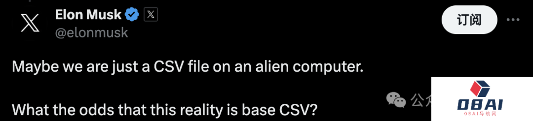 对此,马斯克贡献了一句神评论:我们人类,说不定也只是外星计算机上的一个CSV文件而已。