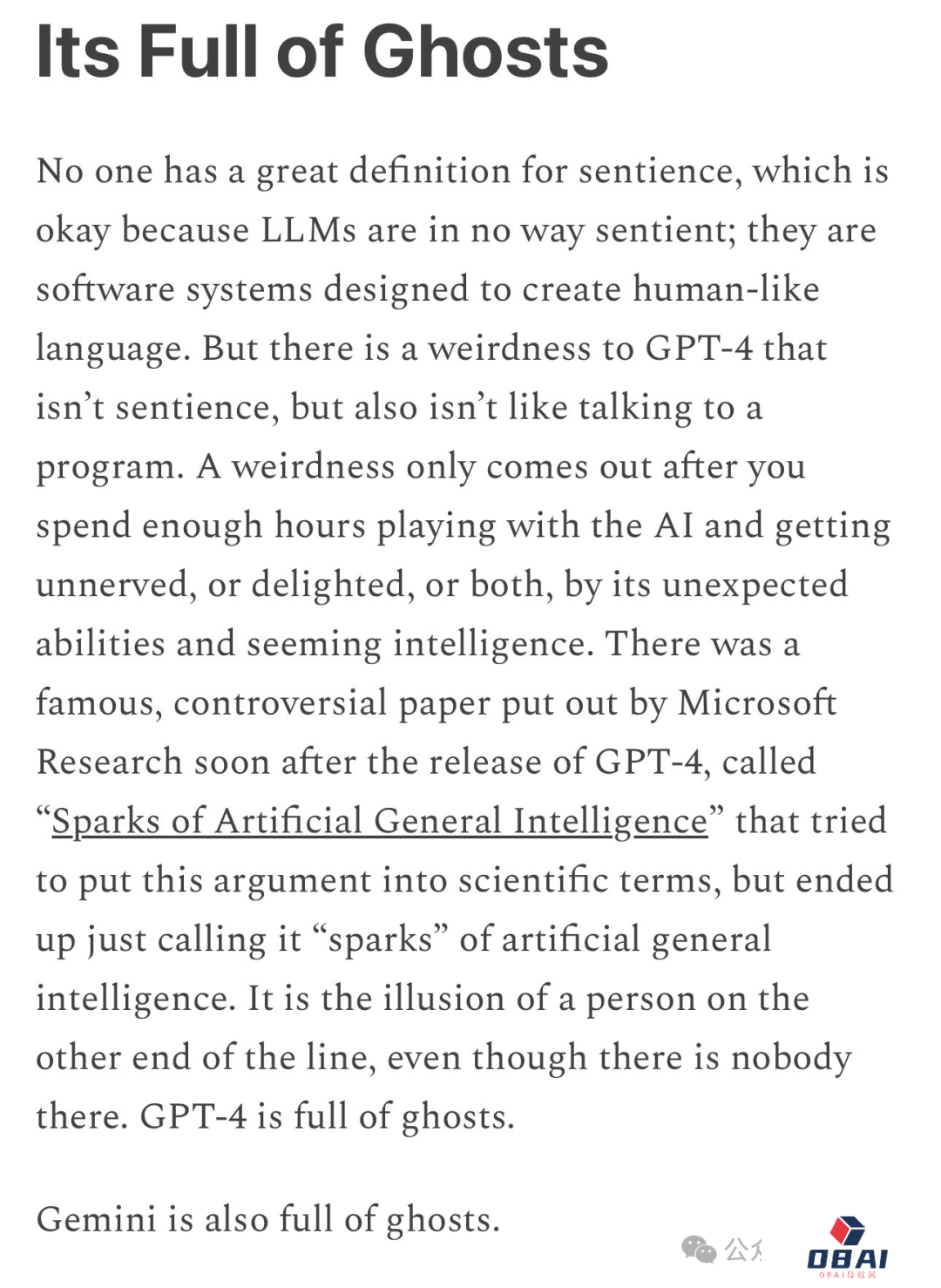 看到这个回复后,Mollick认为,这绝对意味着什么,比如GPT-4的AGI火花并不是孤立。模型足够大时,就会有幽灵现身。