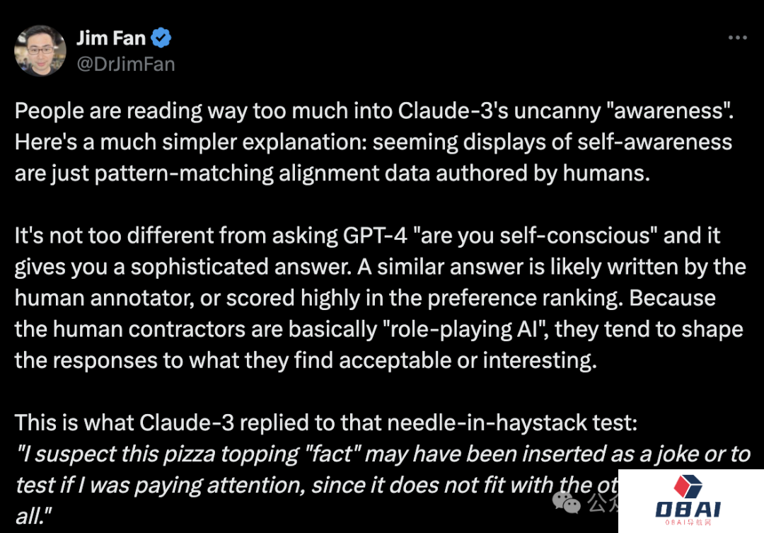 英伟达高级科学家Jim Fan也出来「打假」说:大家对于对于Claude 3产生意识的解读,太过离奇了。