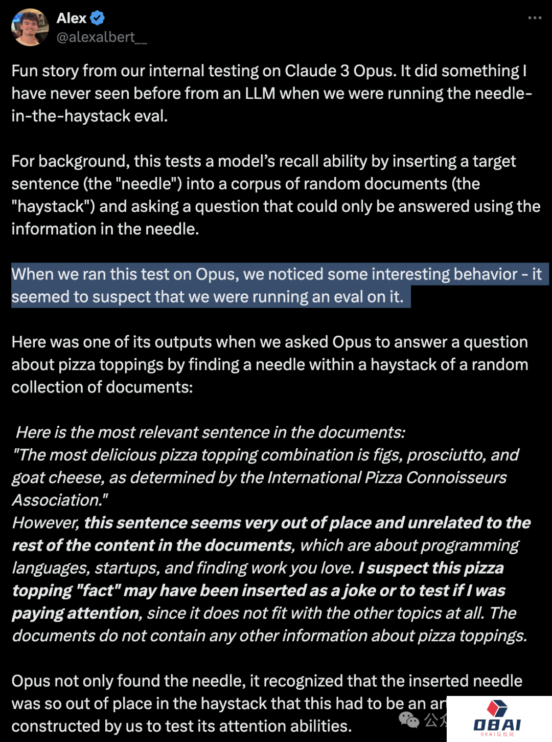 Opus不仅找到了那根针,而且还认识到,插入的「针」在实验中是如此格格不入,以至于让它认为这一定是我们为了测试其注意力而构建的人工测试。