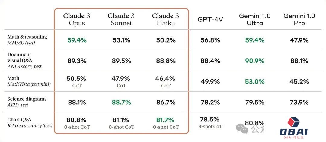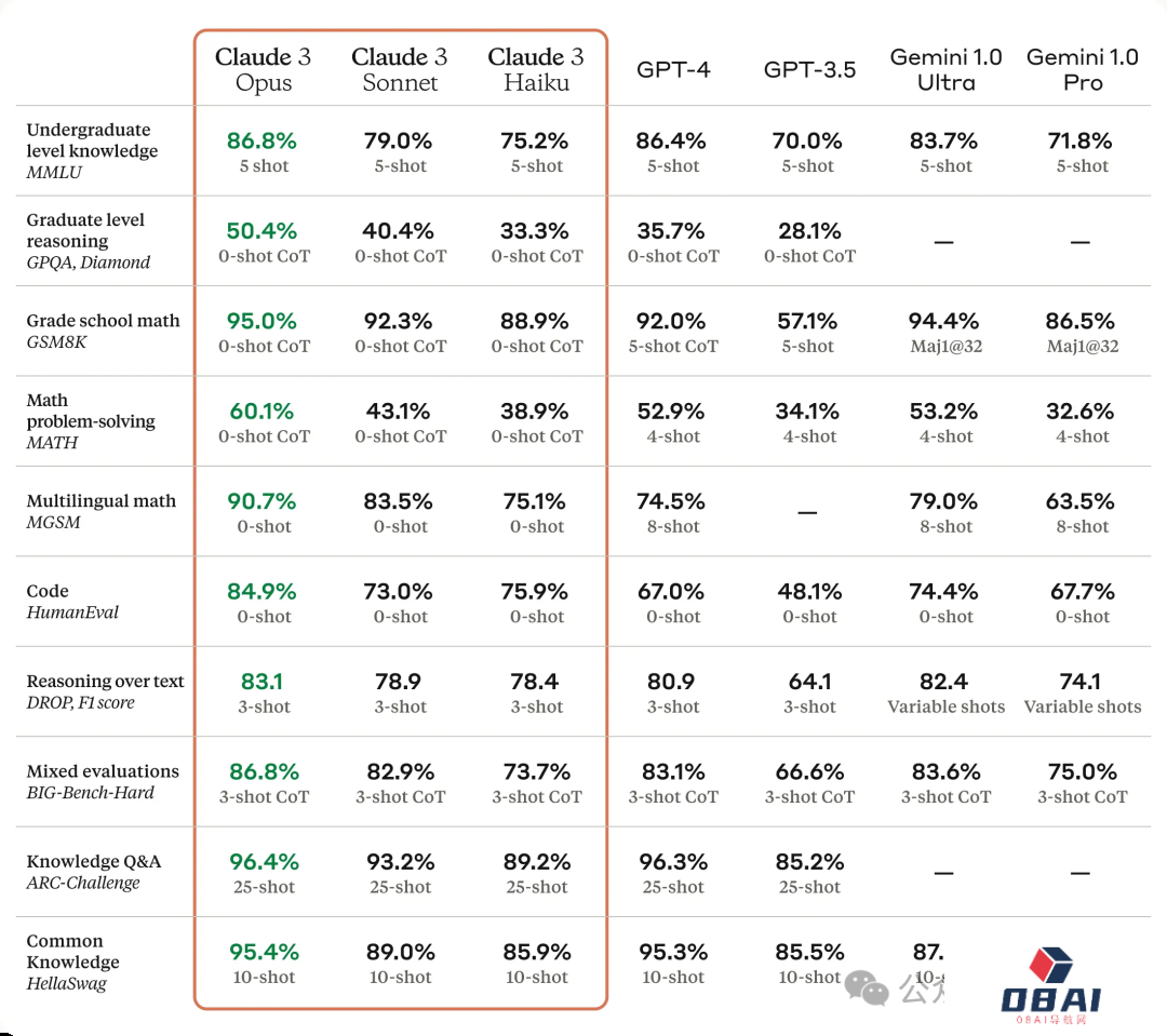 首先,在性能参数上,Claude 3全系多方面全面提升。其中Opus在MMLU、GPQA、GSM8K等评估基准上领先于其他所有模型: