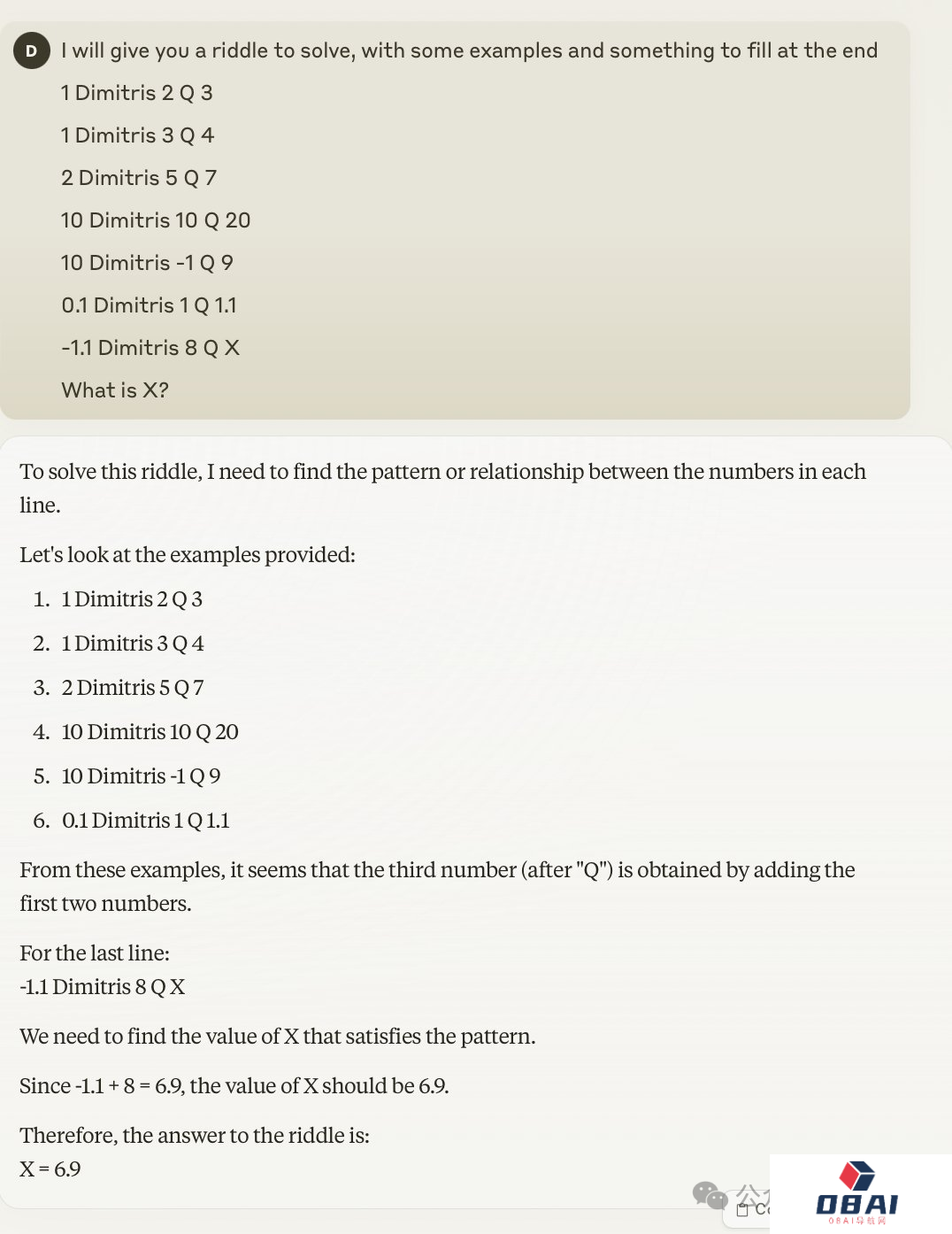 为其提供一些示例,要求它找出数字之间的关系,比如“1 Dimitris 2 Q 3”,意思是3是1和2相加的结果。