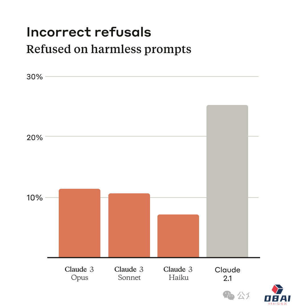 另外,在拒绝回答人类问题方面,Claude 3也前进了一大步,拒绝回答的可能性显著降低