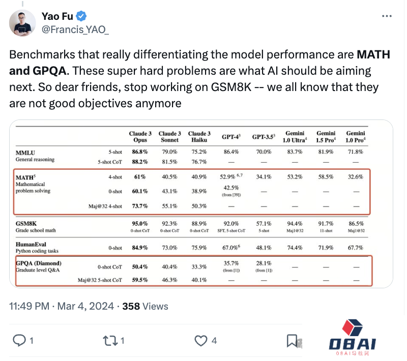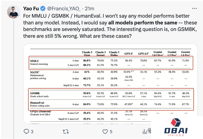 他认为,真正区分模型性能基准的是MATH and GPQA。