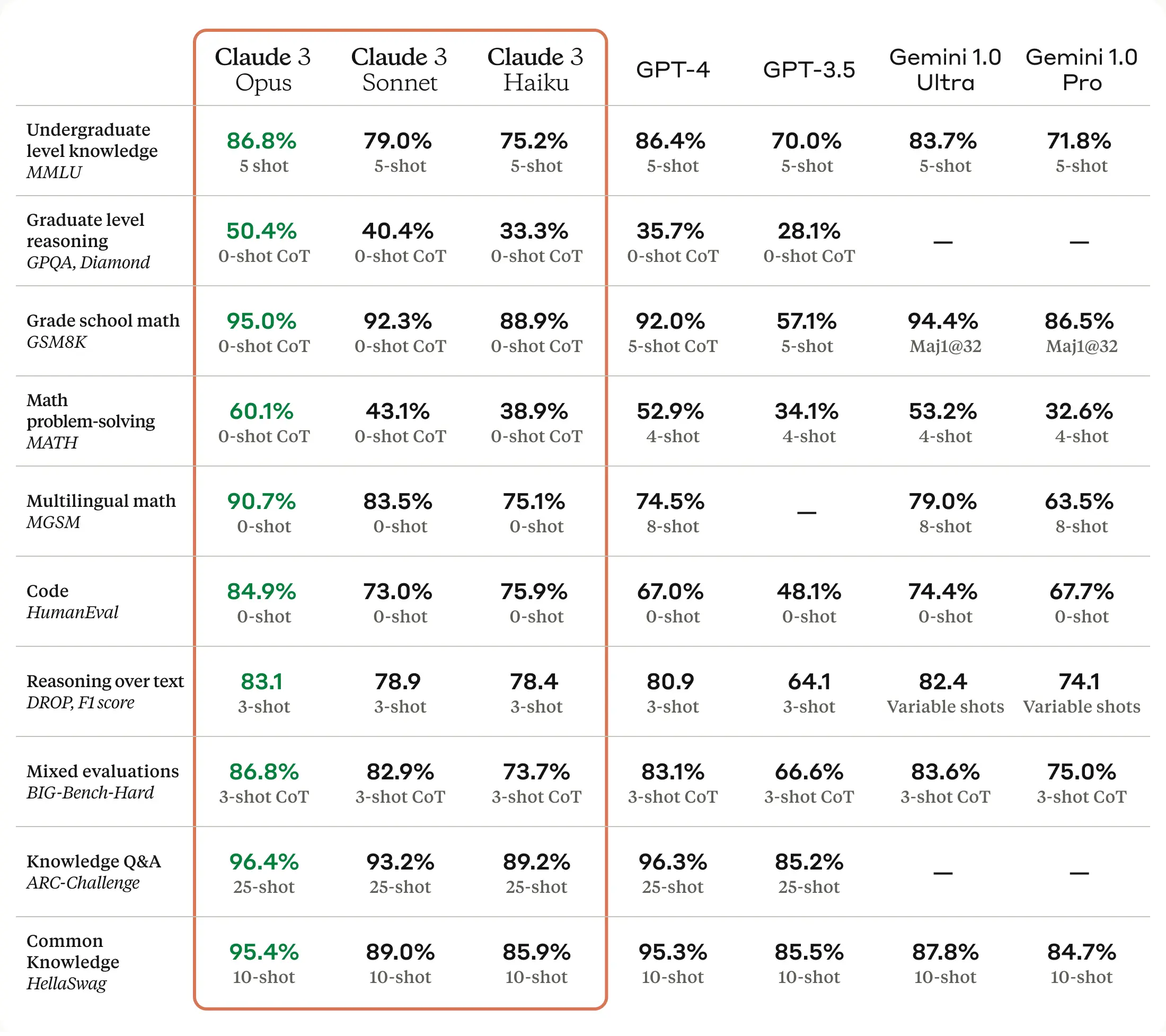 据悉,Claude 3一共有Haiku、Sonnet和Opus三个版本。从官方发布的评测报告来看,根据其评测报告显示,Opus在研究生水平专家推理、基础数学、本科水平专家知识、代码等10个维度,超过OpenAI的GPT-4。