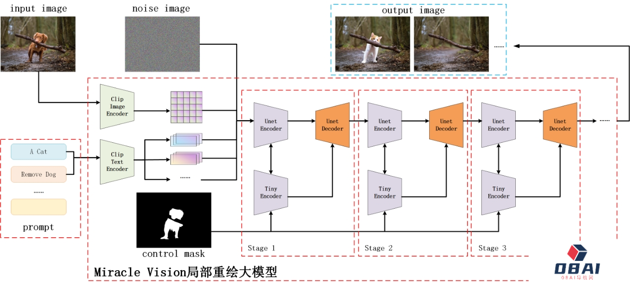 因此,为了充分利用MiracleVision(奇想智能)已有的生成能力,团队在局部重绘模型中不对MiracleVision(奇想智能)的unet模型进行直接微调,而是使用controlnet的方式增加一个mask的输入分支进行控制。