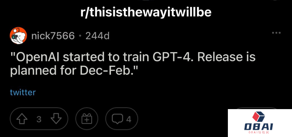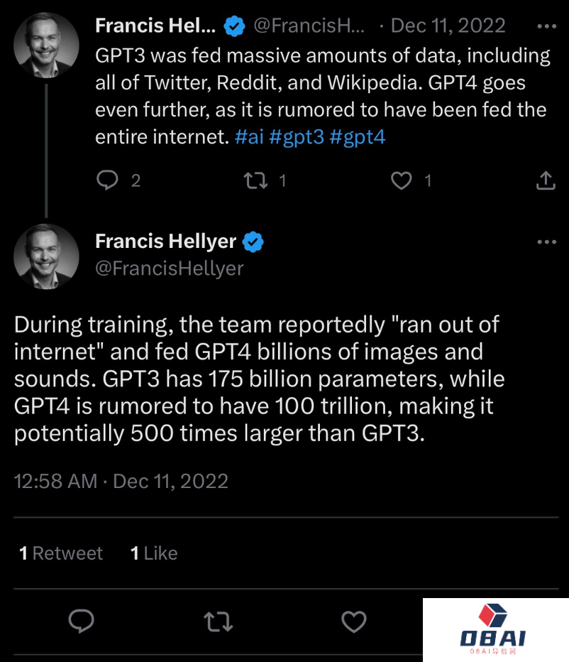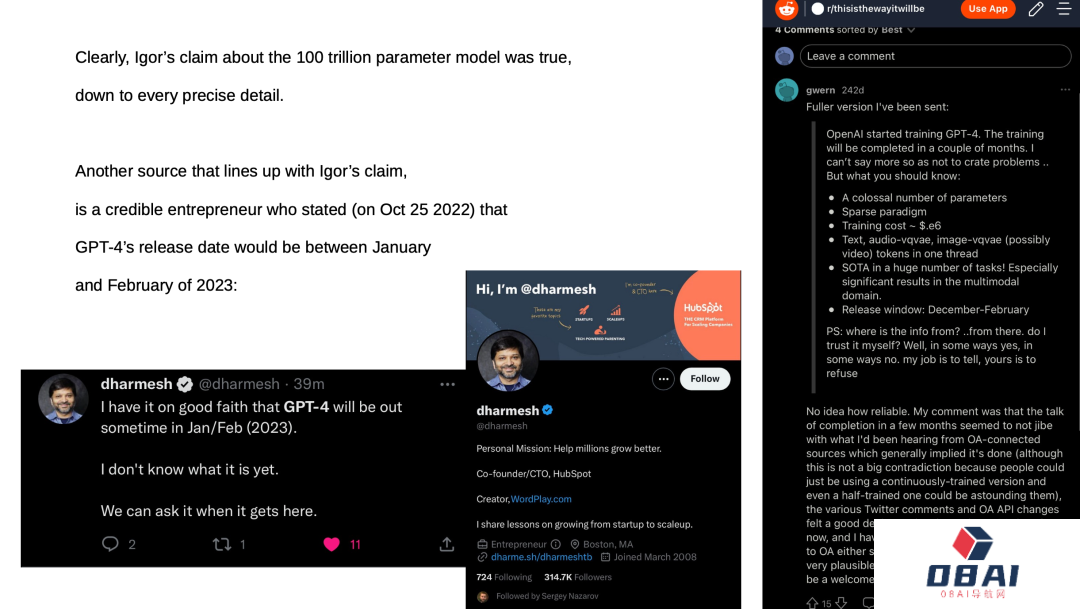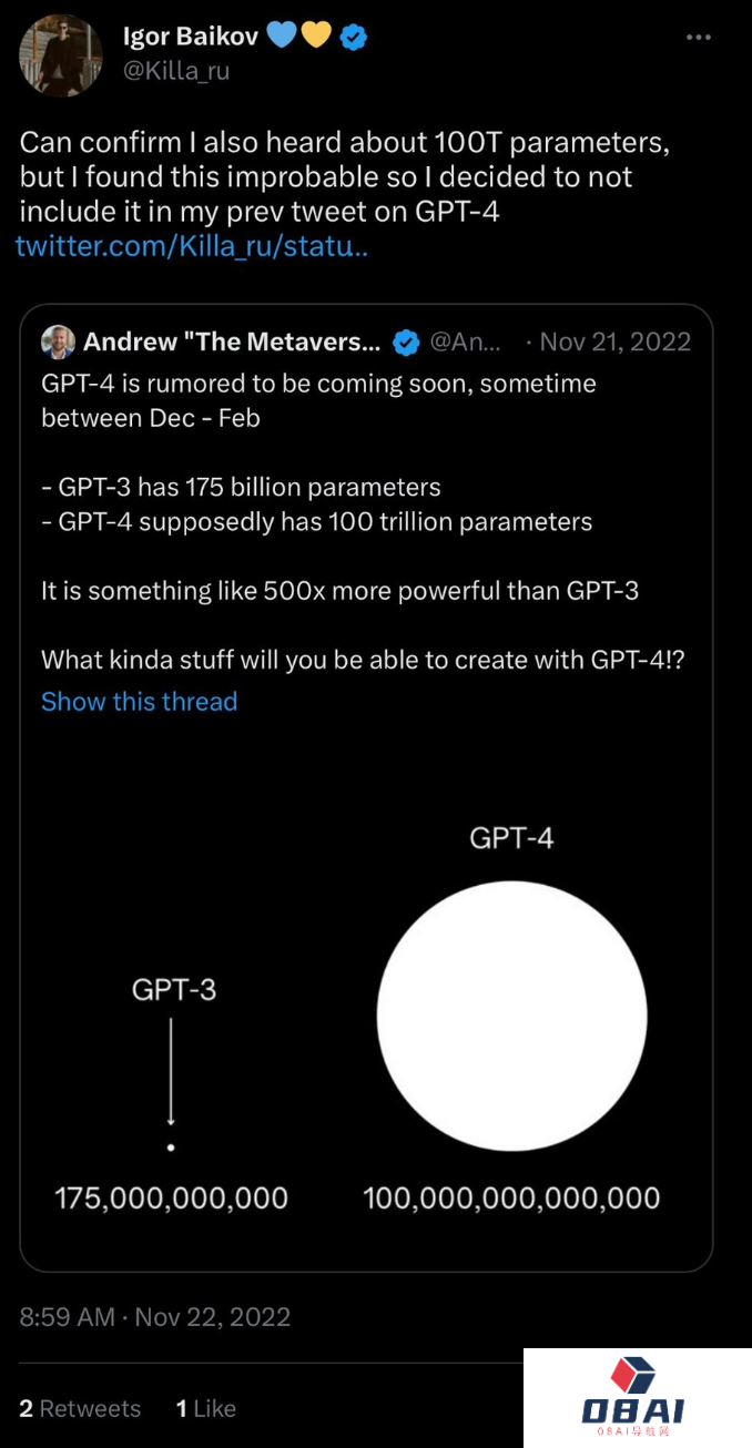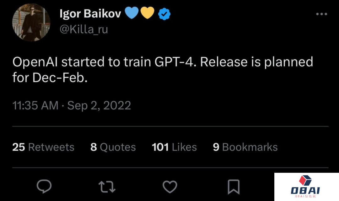 显然,伊戈尔关于100万亿参数模型的说法是真实的,每一个细节都准确无误。另一个与伊戈尔的说法相符的信息源是一位可信的企业家,他在2022年10月25日表示,GPT-4的发布日期将在2023年1月至2月之间: