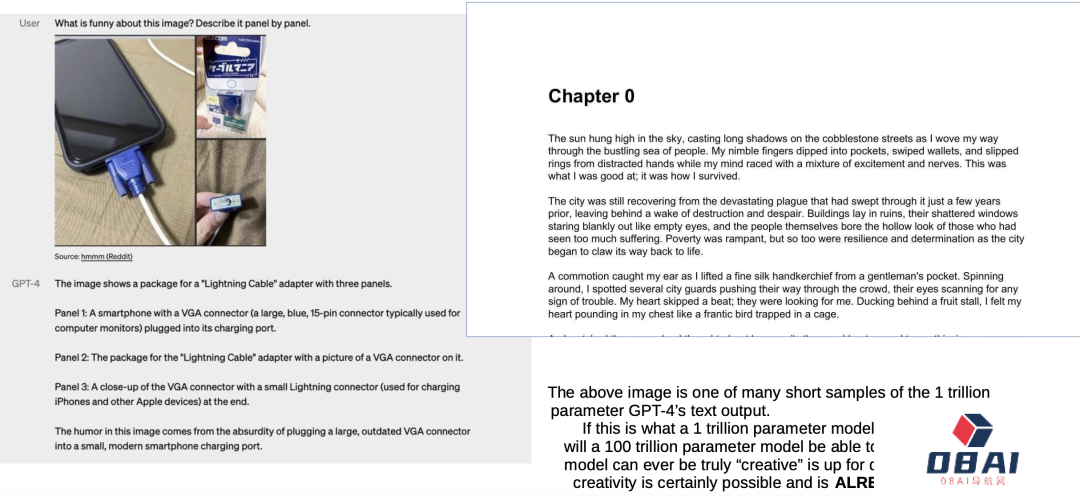 左边的图片展示了1万亿参数的GPT-4在图像识别方面的能力。其回应已经比许多人类所能想出的更加清晰和写得更好。那么,当你在互联网上所有可用数据的基础上训练一个比GPT-4大100倍、与人类大脑大小相当的模型时,会发生什么呢?