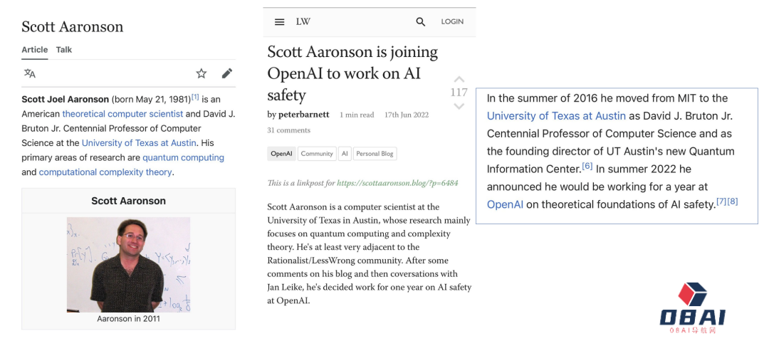 最后,我将揭示一个令人难以置信的信息来源——它来自著名的计算机科学家斯科特·阿伦森(Scott Aaronson)。在2022年夏天,他加入了OpenAI一年,致力于AI安全工作……他在博客上对此发表了一些非常有趣的看法。斯科特·阿伦森在2022年12月底写了一篇博客文章,是一封给他11岁的自己的“信”,讨论了当前事件和他生活中的成就。下一页是令人担忧的部分...