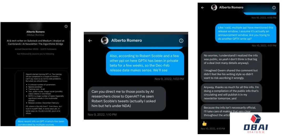 在2022年11月,我联系了一位名叫Alberto Romero的AI博主。他的帖子似乎在网上传播得相当广,所以我希望能给他发送一些关于GPT-4的基本信息,他可能会写一篇文章,这样消息就会传开。这次尝试的结果相当显著,我将在接下来的两页中展示。
