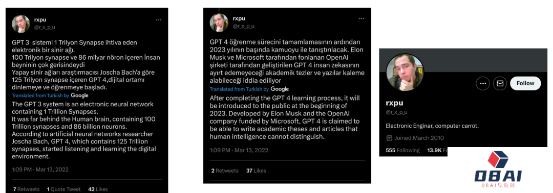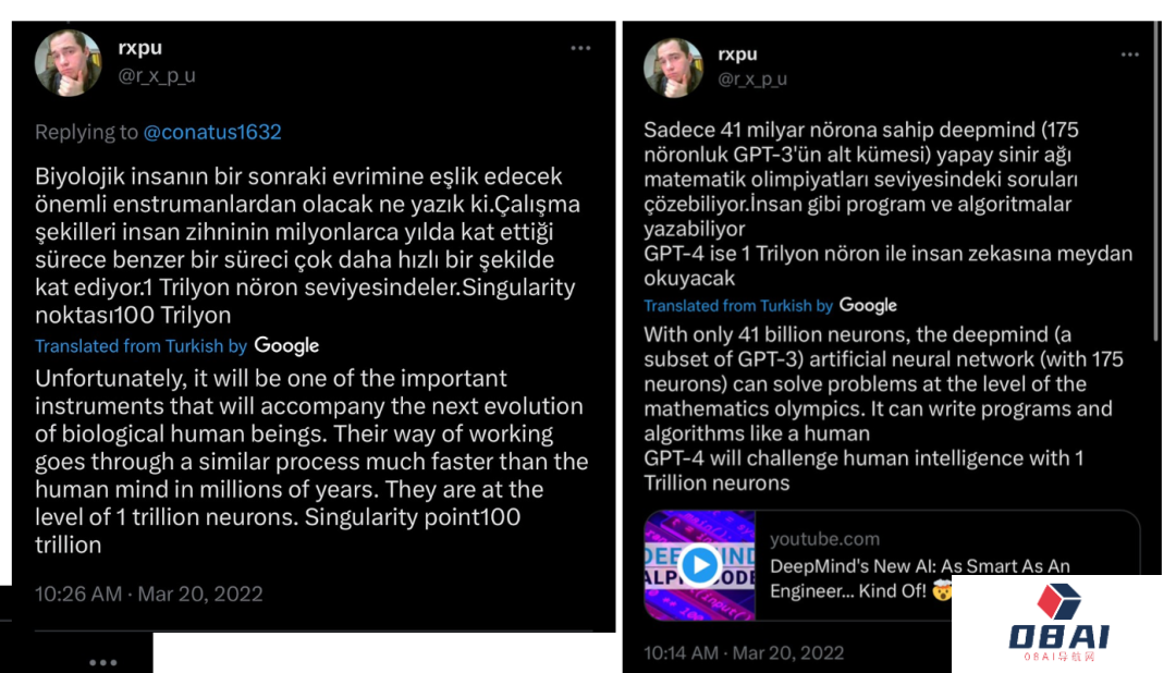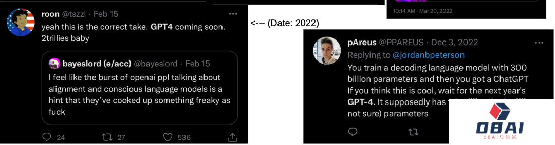 “庞大的参数数量”?听起来伊戈尔·拜科夫是在提到一个100万亿参数的模型,因为在他2022年夏天发推文的时候,500亿参数模型和高达1万亿参数的模型已经被训练了很多次(使得这种规模的模型不再罕见,当然也算不上“庞大”)。来自“rxpu”的这些推文很有趣,看起来这位来自土耳其的AI爱好者(?)是第一个提出关于GPT-4发布窗口的非常相似的声明(相信我——我花了好几个小时,每天都在互联网上搜寻类似的声明,在他之前没有人提出过这个具体的声明)。他还提到了一个“125万亿突触”的GPT-4——然而,他错误地将GPT-3的参数数量说成了1万亿。(看起来rxpu确实有一些内部信息,但在参数数量上有些混淆——稍后我会进一步说明这一点,并证明rxpu并没有说谎)。