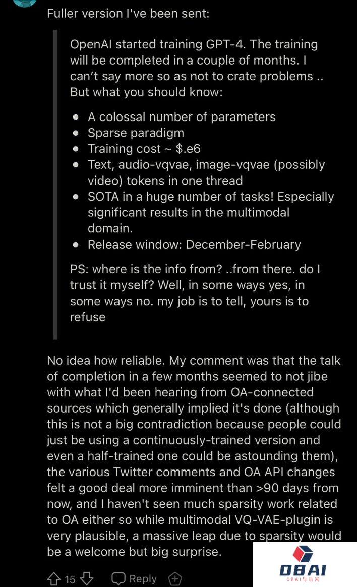 AI研究员伊戈尔·拜科夫(Igor Baikov)仅几周后声称,GPT-4正在训练中,并将在12月至2月间发布。再次强调,我将证明伊戈尔确实拥有准确的信息,并且是一个可信的信息源。这一点很快就会变得重要。