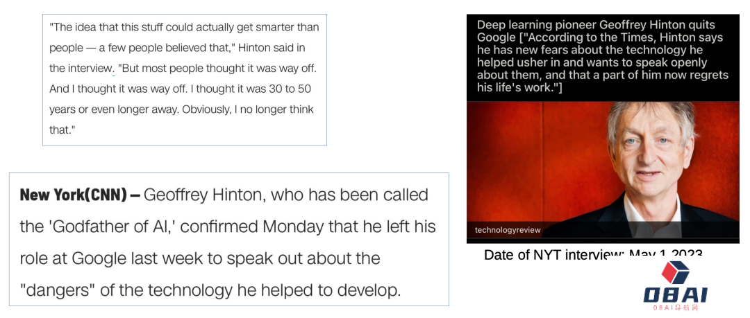 “我曾经认为这还需要30到50年,甚至更长的时间。显然,我现在不再这么认为了。”来自CNN的报道AI之父离开google的新闻。