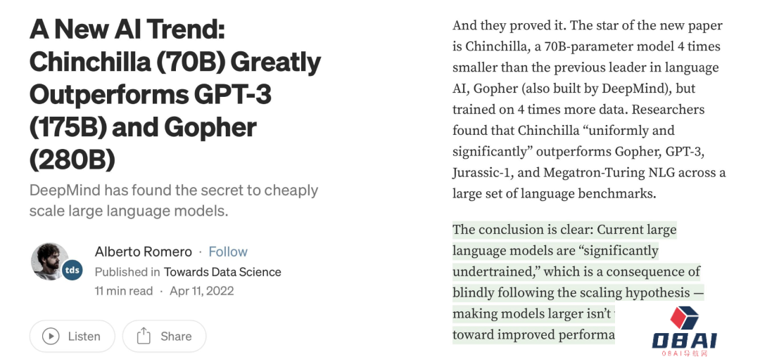 Chinchilla是DeepMind在2022年初公布的一个AI模型。Chinchilla研究论文的含义是,当前的模型训练得远远不够,而且如果有更多的计算资源(意味着更多的数据),性能将会大幅提升,而无需增加参数。