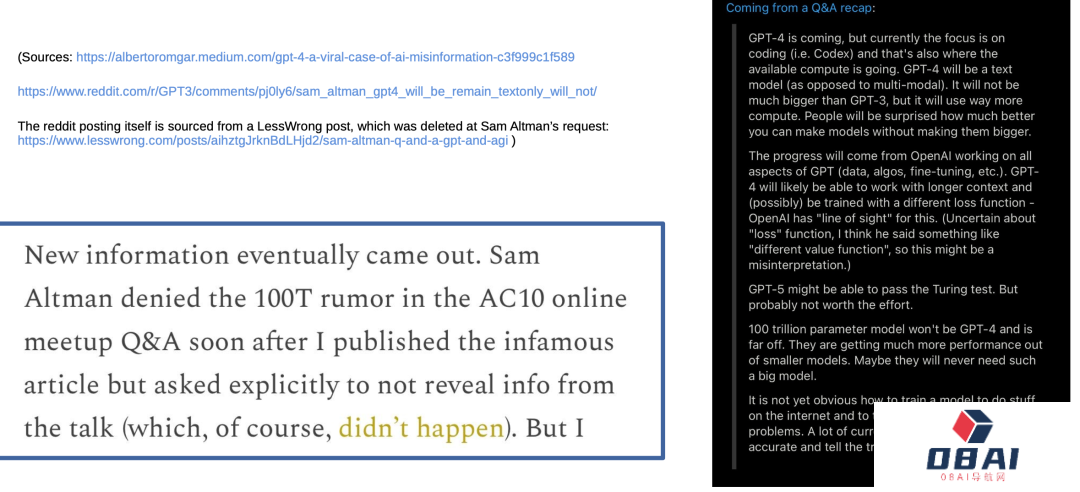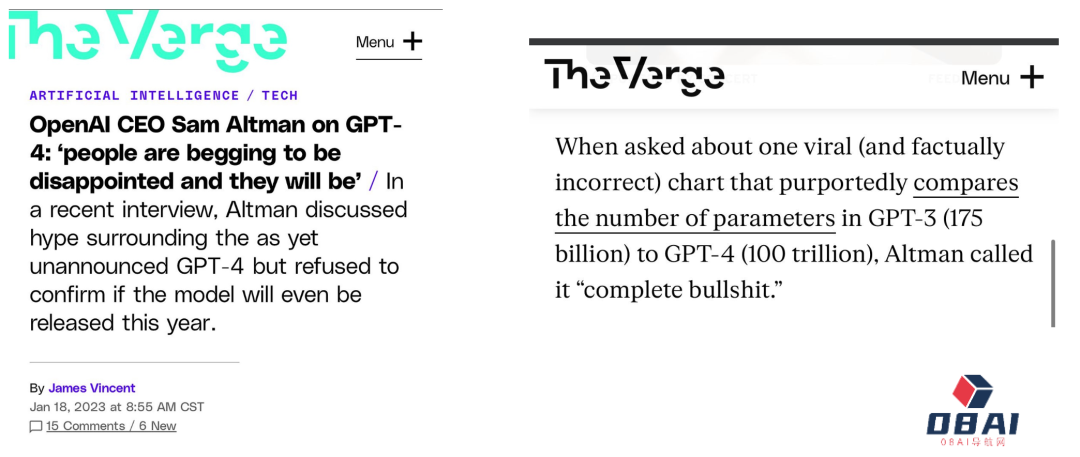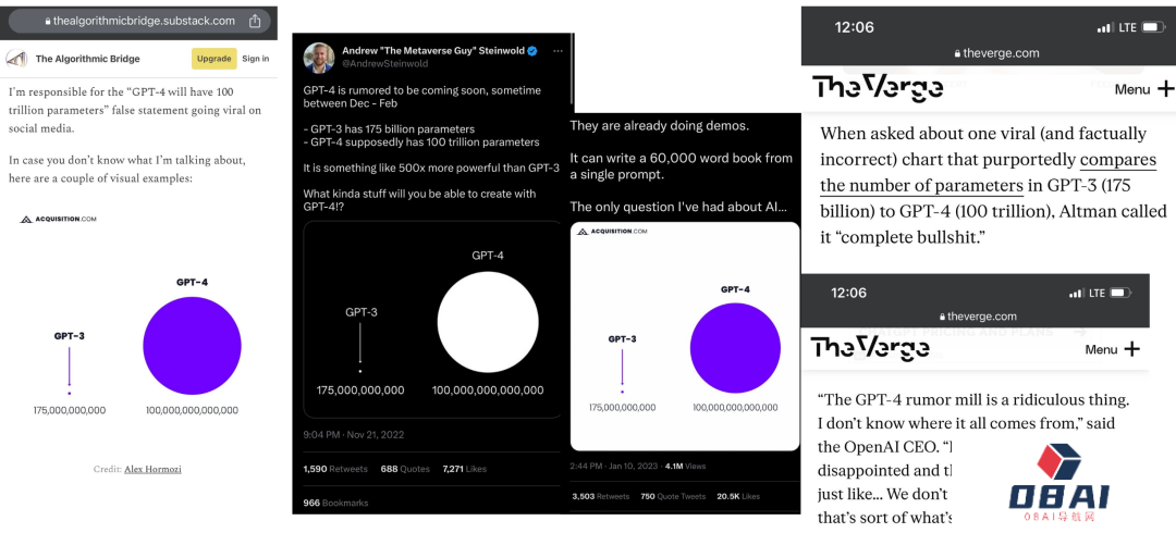 100万亿参数的泄露信息迅速传播开来,触及了数百万人,以至于包括首席执行官Sam Altman在内的OpenAI员工不得不做出回应——称之为“完全是胡说八道”。The Verge称其为“事实上的错误”。正如你在左边看到的,Alberto Romero声称对这次泄露负责。