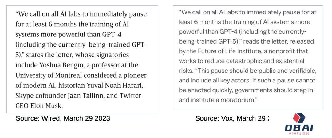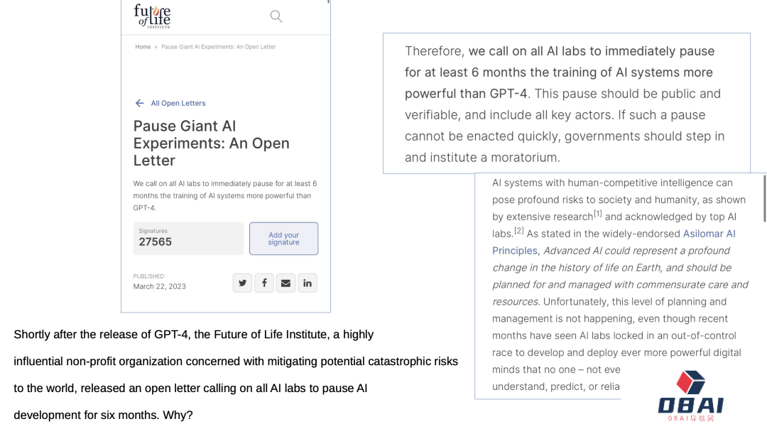 在GPT-4发布后不久,未来生活研究所(Future of Life Institute),这是一个高度有影响力的非营利组织,致力于减轻对世界可能的灾难性风险,发布了一封公开信,呼吁所有AI实验室暂停AI开发六个月。为什么呢?