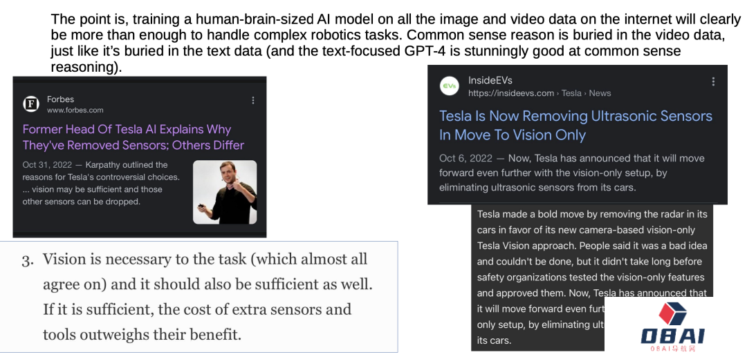 关于机器人学的一点说明:AI研究员开始相信,视觉是实现最佳现实世界/物理性能所必需的全部。举一个例子,特斯拉完全放弃了所有传感器,全力投入到自动驾驶汽车的视觉技术上。