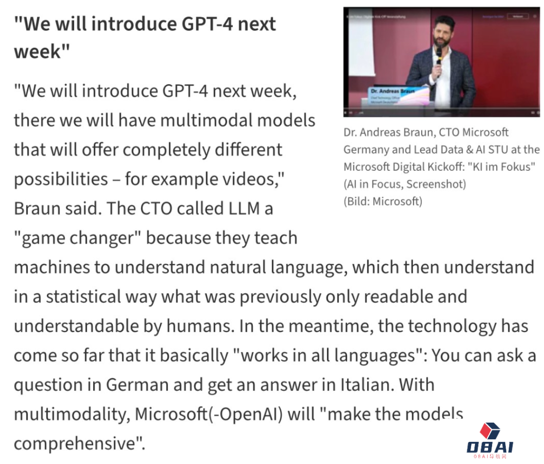 在GPT-4正式发布前一周,德国微软的首席技术官似乎失言,透露存在一个GPT-4.它具有处理视频的能力。我猜想他可能不知道OpenAI决定不公开该系统的视频功能。