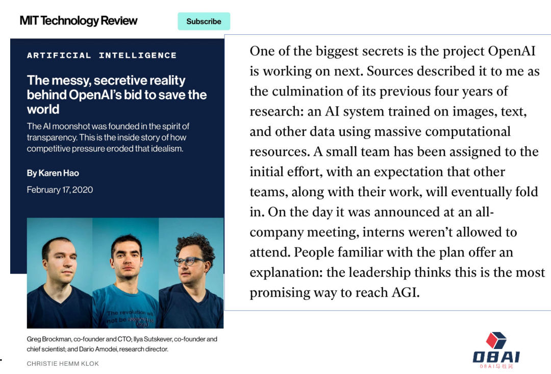 直到2020年2月,也就是GPT-3发布前几个月。一篇来自《技术评论》的文章,这是关于OpenAI的“内部故事”,似乎表明OpenAI正处于一个“秘密”项目的早期阶段,涉及一个在图像、文本和“其他数据”上训练的AI系统,而且OpenAI的领导层认为这是实现AGI最有希望的方式。我在想这可能指的是什么。