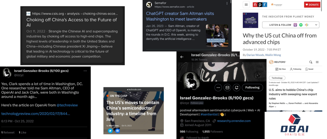 从2022年7月开始,美国开始采取措施阻止新的计算机芯片被送往中国,试图阻止他们的AI进展。这个计划在2022年10月最终确定。根据旧金山的AI研究员Israel Gonzales-Brooks的说法,Sam Altman在2022年9月访问了华盛顿特区。Israel声称与Sam Altman有联系(我无法验证这一点),但他的可信度来自于Sam Altman在2023年1月确实被证实访问了华盛顿特区的事实。