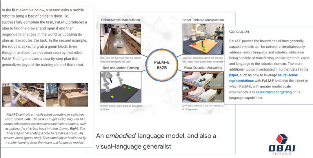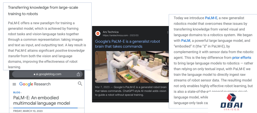 Google最近的一个例子,展示了机器人学能力是如何从大型视觉/语言模型中学习的。(在语言和视觉训练的基础上,只需要最少的机器人学数据,视觉和文本任务的知识就可以转移到机器人学任务上。OpenAI正在“互联网上的所有数据”上训练他们的100万亿参数模型,这无疑将包括机器人学数据)。Palm-E是一个约5000亿参数的模型——当你在互联网上所有可用数据的基础上训练一个100万亿参数的模型时,机器人学性能会发生什么变化?(关于Google的Palm-E模型的更多信息将在下一页介绍)。