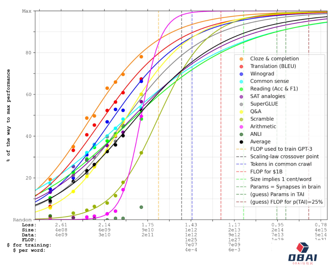 人类大脑大约有2e14个突触(来源),这与神经网络中的参数数量大致相当(绿线)。深绿线标志着根据Ajeya Cotra的模型61.变革性模型参数数量的中位数估计。值得注意的是,这个估计非常接近于基准测试接近最佳性能时的情况。80%的置信区间在3e11和1e18参数之间,覆盖了从GPT-3的规模一直到超出我的图表边缘的范围。