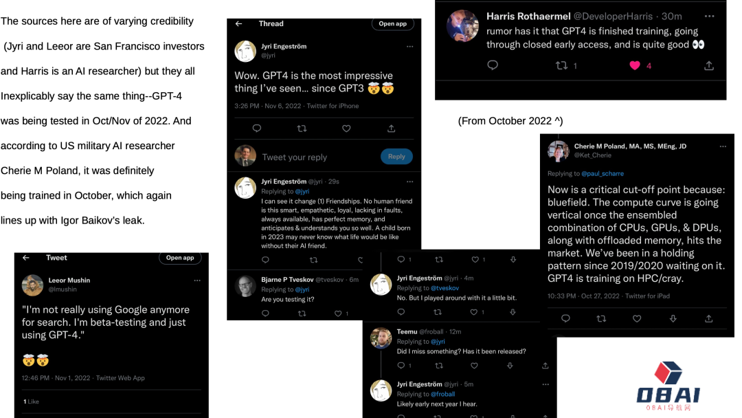 这里的信息源可信度各不相同(Jyri和Leeor是旧金山的投资者,Harris是一位AI研究员),但他们都不约而同地说了同样的事情——GPT-4在2022年10月/11月正在被测试。根据美**方AI研究员Cherie M Poland的说法,它肯定在10月份正在被训练,这再次与伊戈尔·拜科夫的泄露信息相吻合。