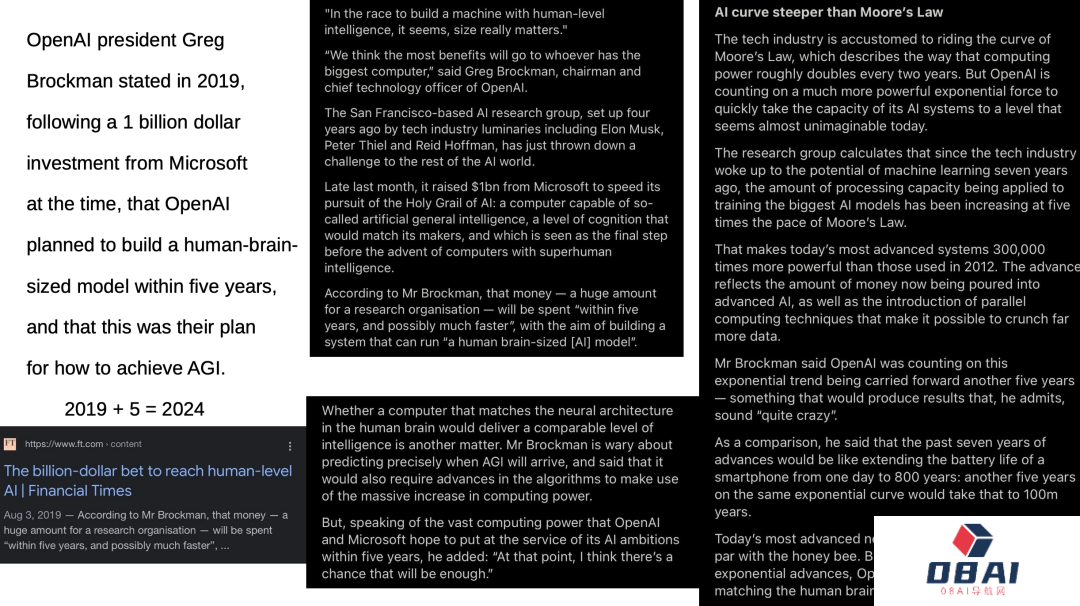 OpenAI的总裁Greg Brockman在2019年表示,在微软当时投资了10亿美元之后,OpenAI计划在五年内构建一个与人类大脑大小相当的模型,而这正是他们实现AGI的计划。2019 + 5 = 2024.