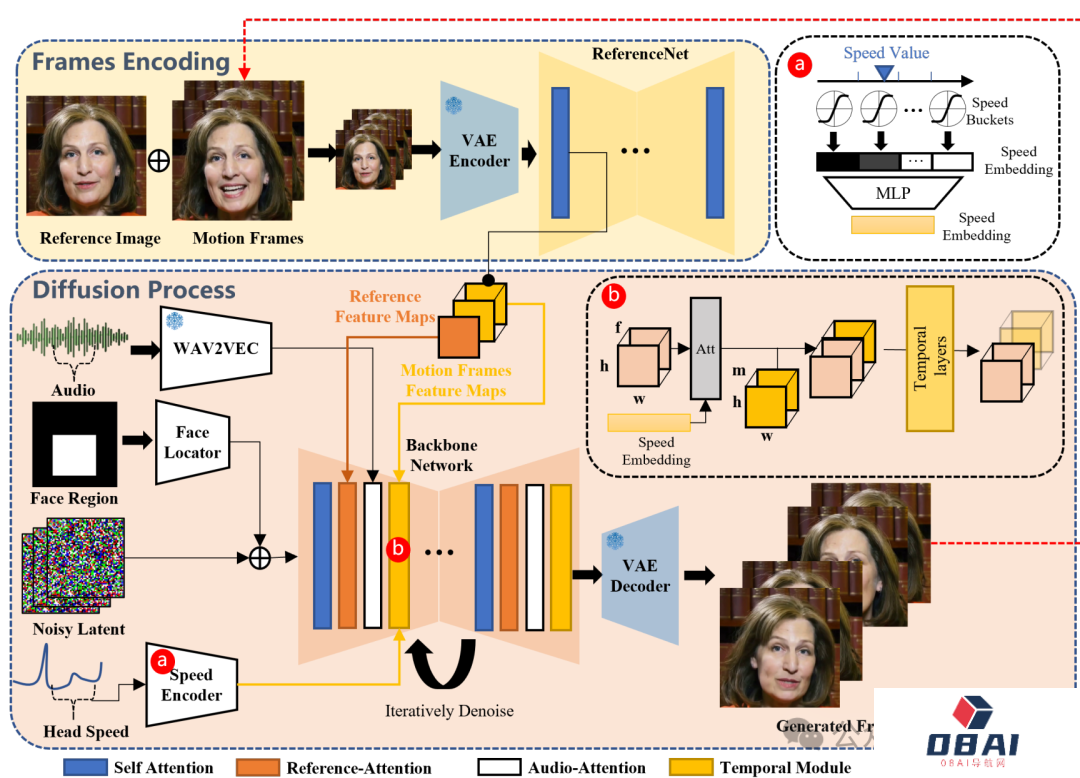 首先,预训练的音频编码器处理音频嵌入,人脸区域掩模与多帧噪声相结合来控制人脸图像的生成。