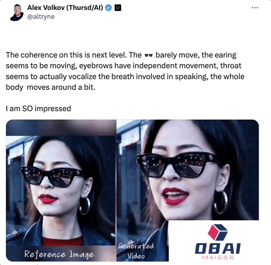 一分多钟的视频里,Sora女士脸上的墨镜几乎没有乱动,耳朵、眉毛都有独立的运动。