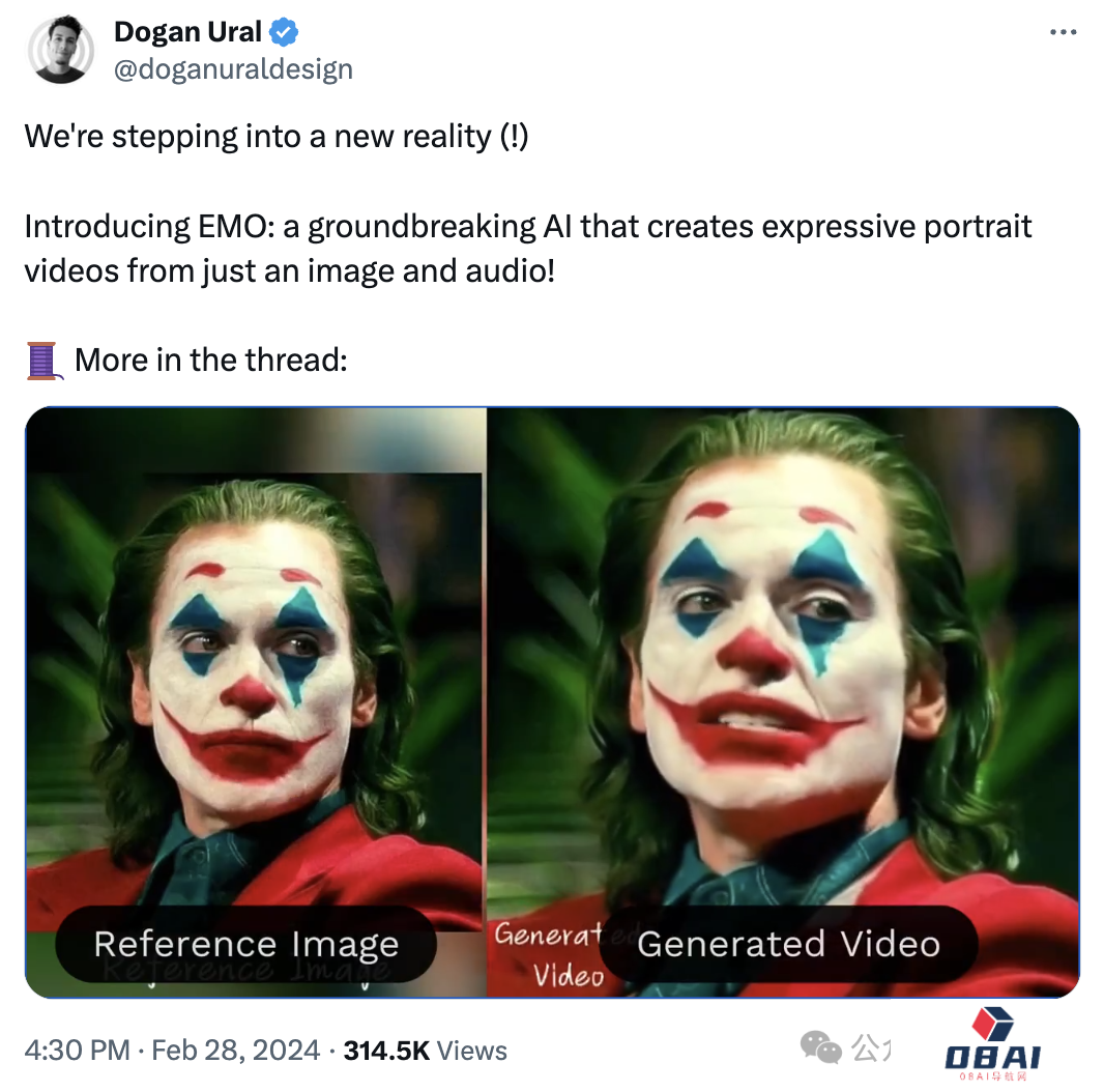 总之,不管是让肖像唱歌(不同风格的肖像和歌曲)、让肖像开口说话(不同语种)、还是各种“张冠李戴”的跨演员表演,EMO的效果,都让咱看得一愣一愣的。