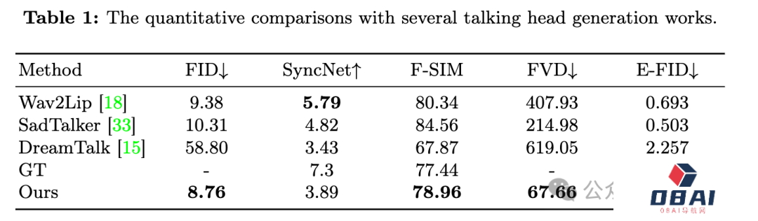 在定量比较上也比之前的方法有较大提升取得SOTA,只在衡量口型同步质量的SyncNet指标上稍逊一筹。