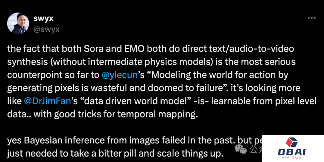因此有人认为,这与Lecun坚持的“通过生成像素来为动作建模世界是浪费且注定要失败的”观点相悖,更支持了Jim Fan的“数据驱动的世界模型”思想。