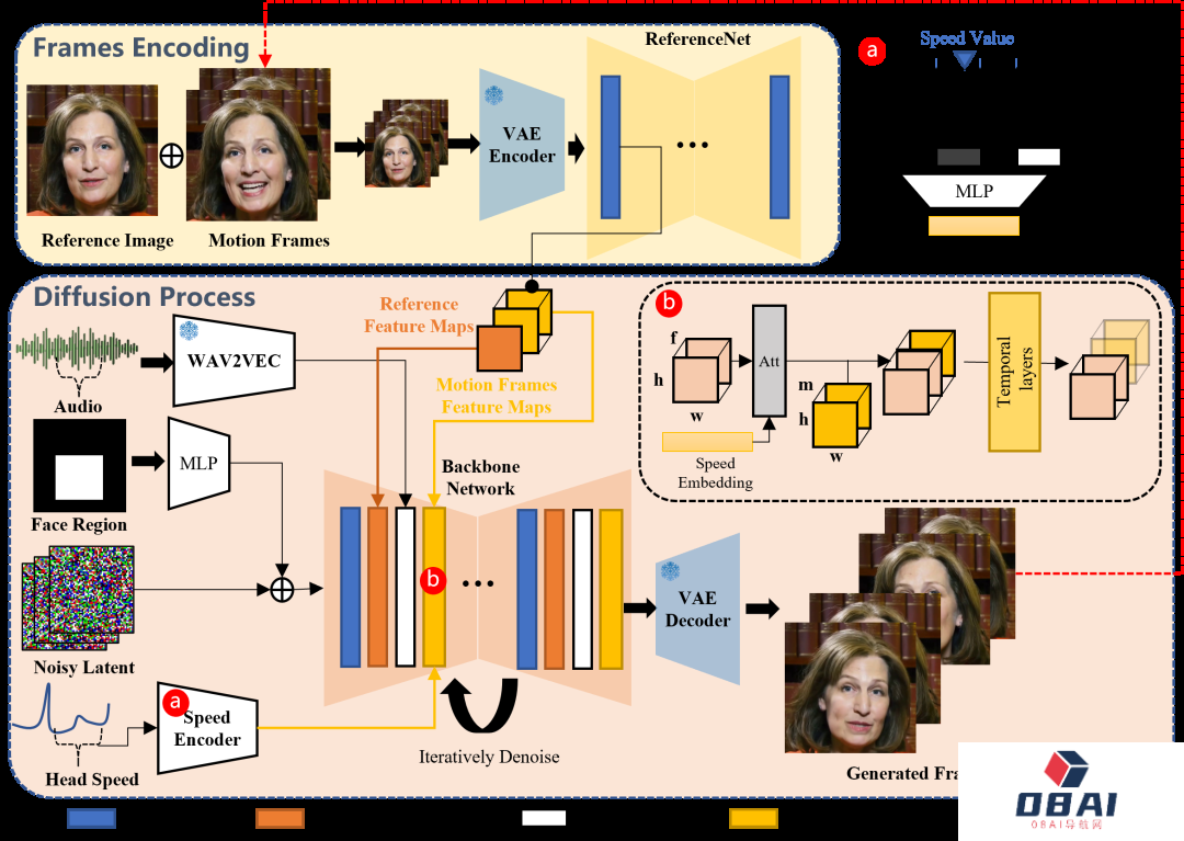 这两种机制分别对于维持角色的独特性和调节角色的动作至关重要。此外,还使用了时间模块(Temporal Modules)来处理时间维度的视频帧排序,以及调整面部神态的运动速度。