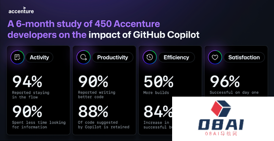 根据埃森哲的调查数据显示,94%的开发人员表示,使用 GitHub Copilot 有助于他们减少在重复性编码任务上花费的精力;90%的开发人员花在搜索信息上的时间更少。