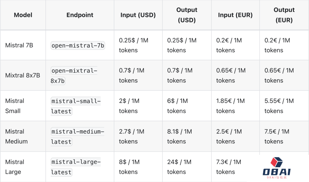 在定价方面,旗舰版的大模型Mistral Large的定价略低于GPT-4 Turbo。Mistral Large为输入0.008美元/1000 Tokens,GPT-4 Turbo为0.01美元/1000 Tokens,输出Mistral Large是0.024美元/1000 Tokens,GPT-4 Turbo为0.03美元/1000 Tokens。