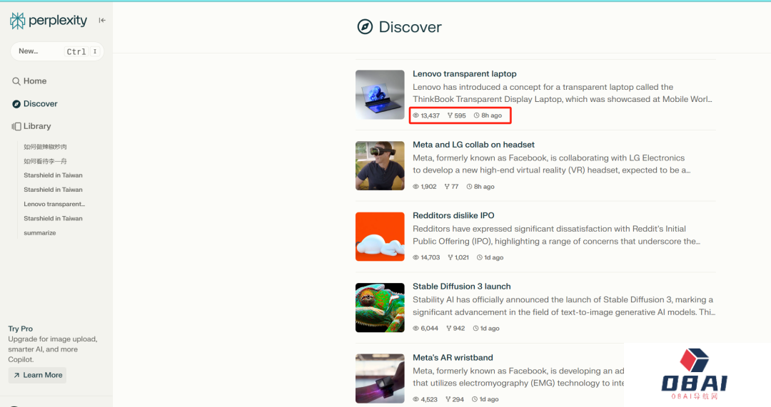除了提供关键词进行搜索外,Perplexity AI还设置了一个「发现」页面,用于展示近期的热门新闻。