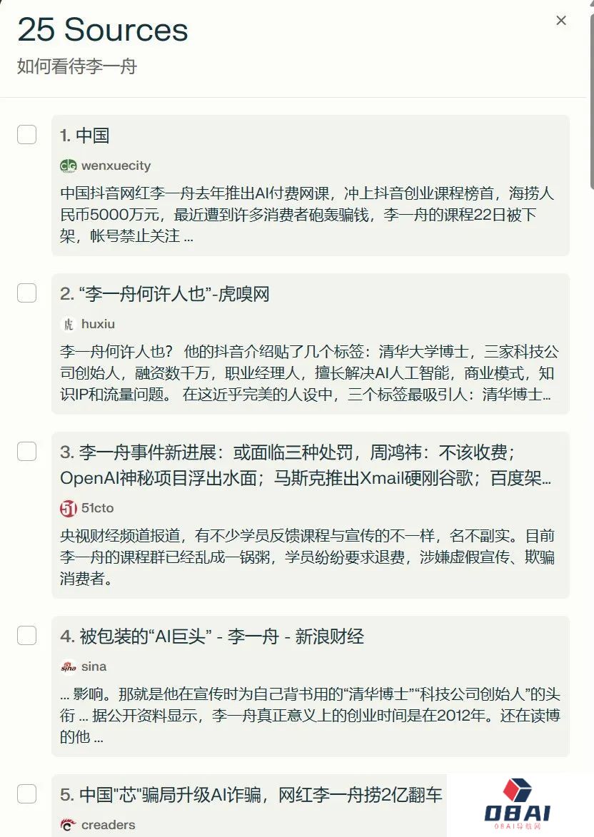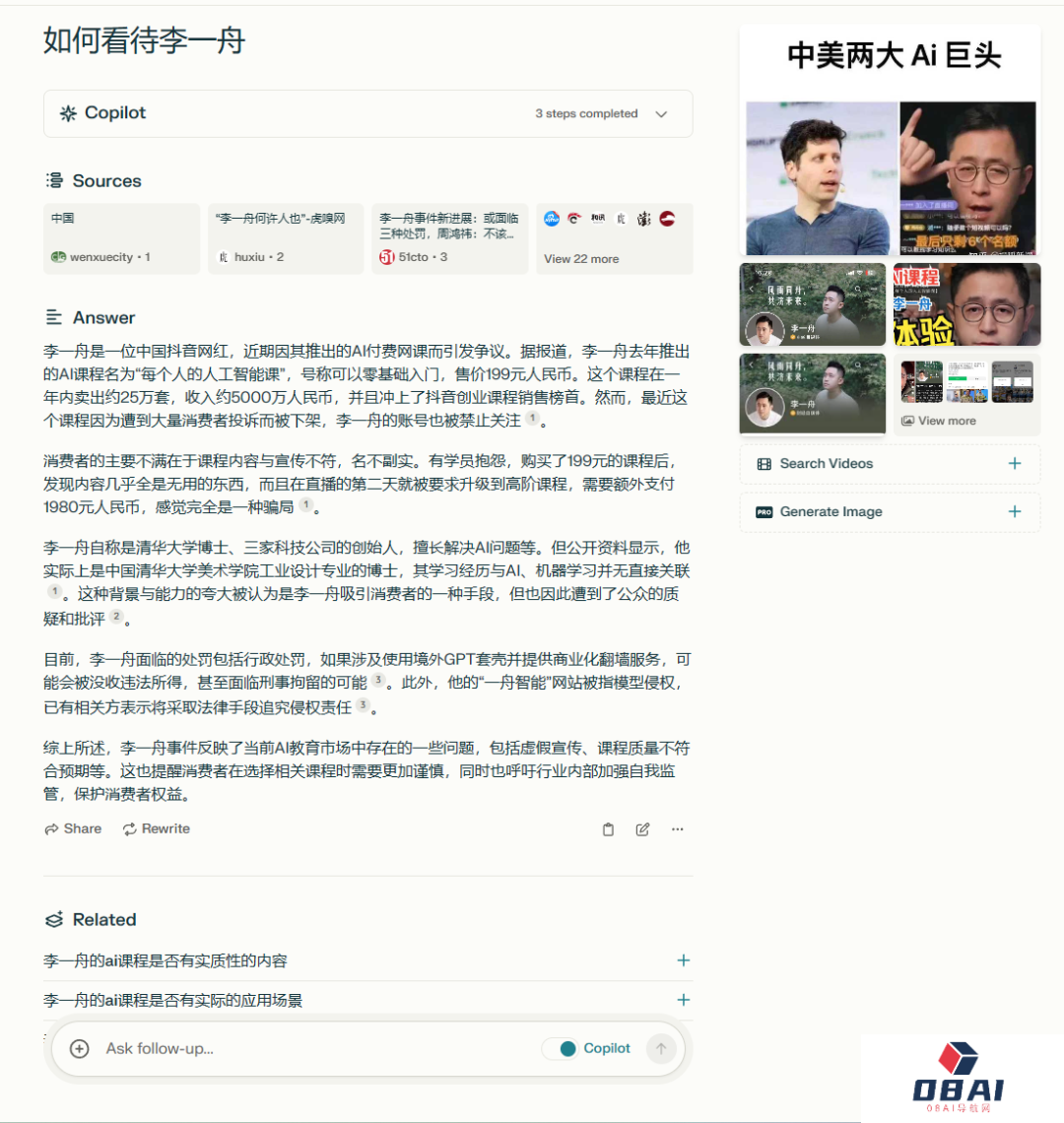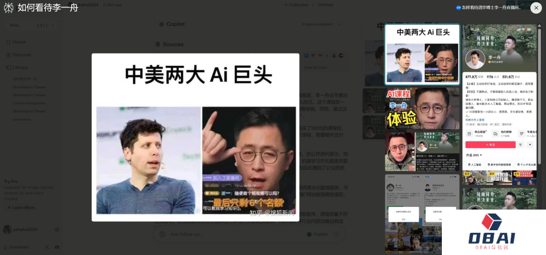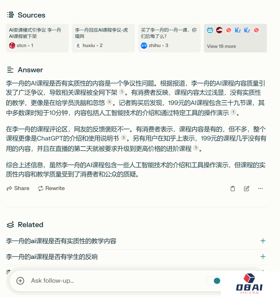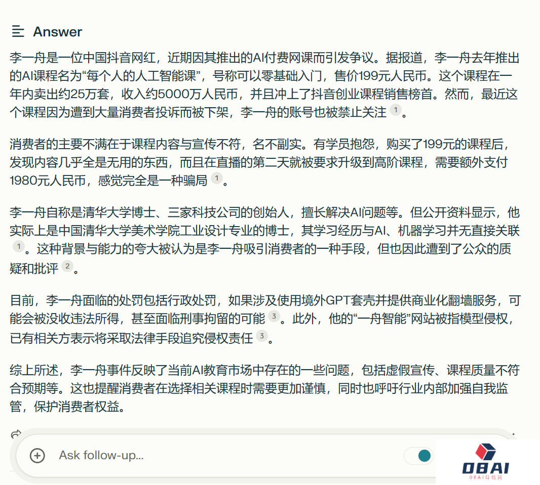之后我继续提问“如何看待李一舟”。简单看了一下,Perplexity AI回答的内容条理清晰,也有对应的观点。
