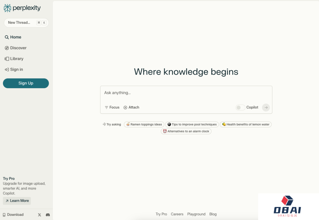 直观来说,Perplexity的用户界面十分干净,主要由左边的标签栏和右边的搜索框组成。