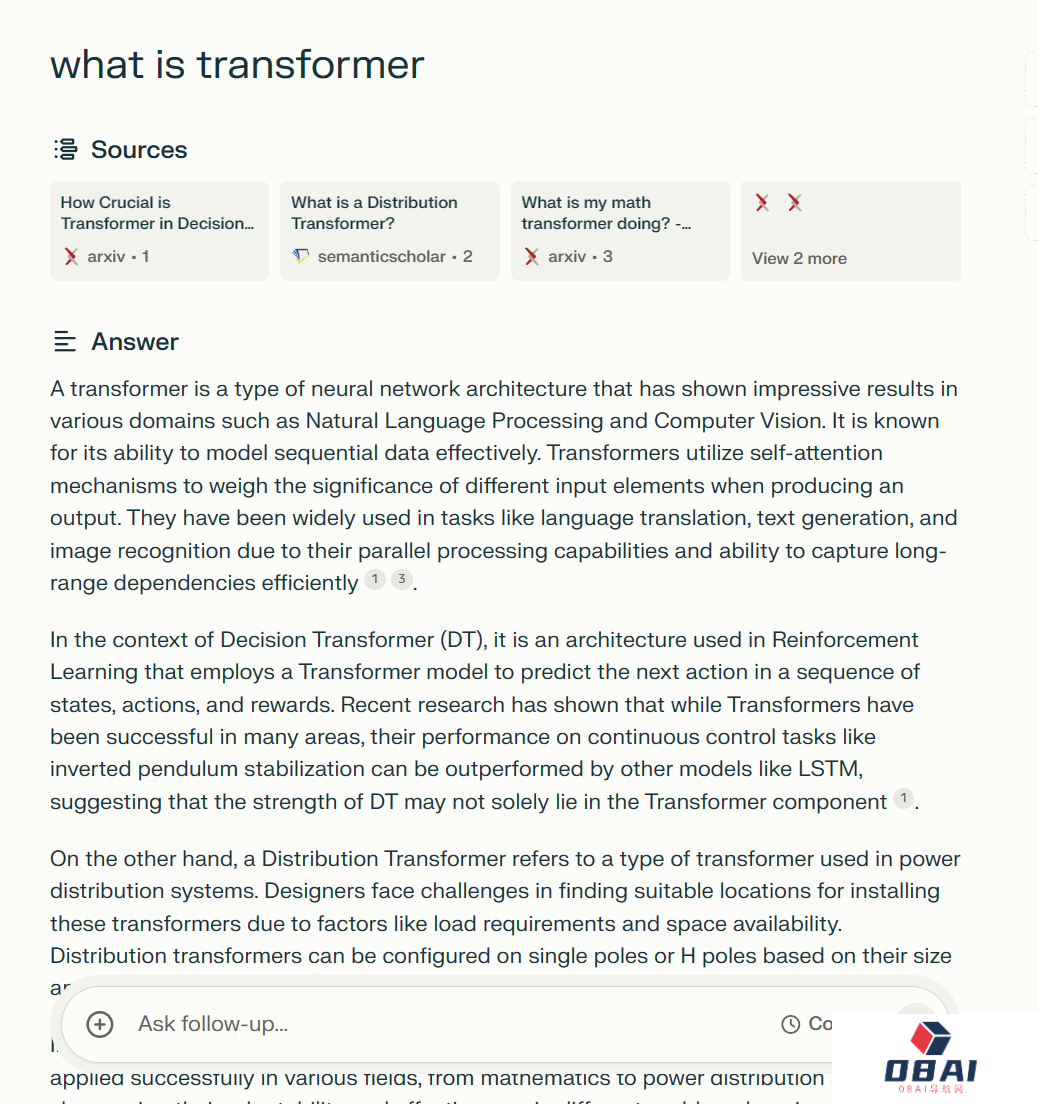 当我尝试搜索?「什么是Transformer架构」,Perplexity AI引用的结果来源都是arxiv、semanticscholar等等专业的学术网站,给人的感觉就十分可靠。