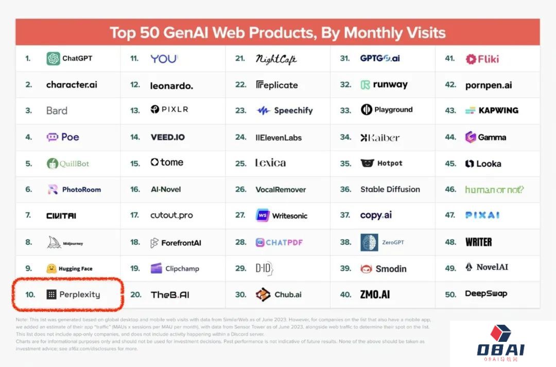 根据科技风投公司a16z发布的12月最新报告显示,Perplexity AI进入了全球最受欢迎的TOP10生成式AI产品。