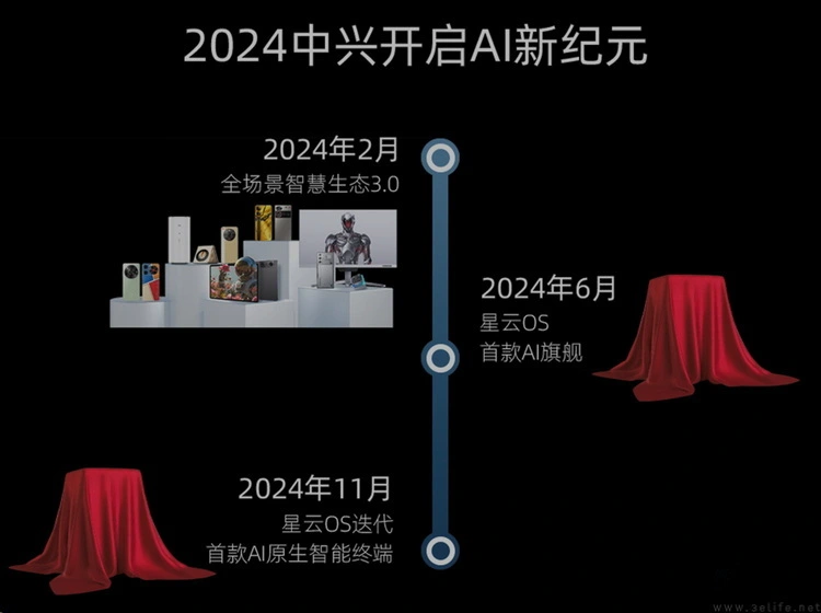 中兴方面就在MWC现场一口气端出了至少十款新品。按照中兴方面公布的信息显示,2024年2月,中兴全场景智慧生态3. 0体系建构完成,到了2024年6月,搭载星云OS的首台中兴AI旗舰手机将会正式亮相。