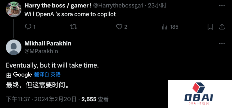 有用户询问Mikhail Parakhin是否会在Copilot上推出Sora,Parakhin给出了肯定的答复:“最终会落地,但这需要时间。”