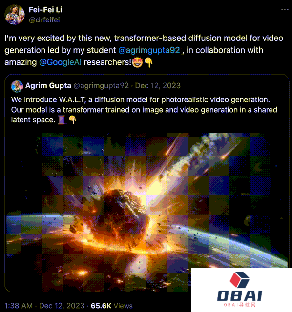 无独有偶,斯坦福学者李飞飞在去年年底,就用Transformer就做出了逼真的视频。